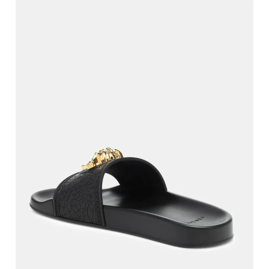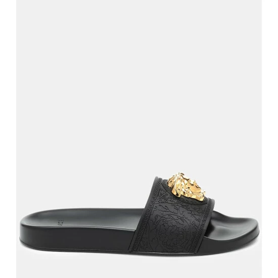 Conjure a Miami mood – no matter the locale – in these slides from Versace. Made in Italy from black rubber with a molded footbed for comfort, the style incorporates several house motifs, from Greek Key and Baroque embossing across the upper to iconic Medusa-head embellishments at the center.