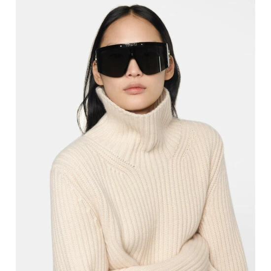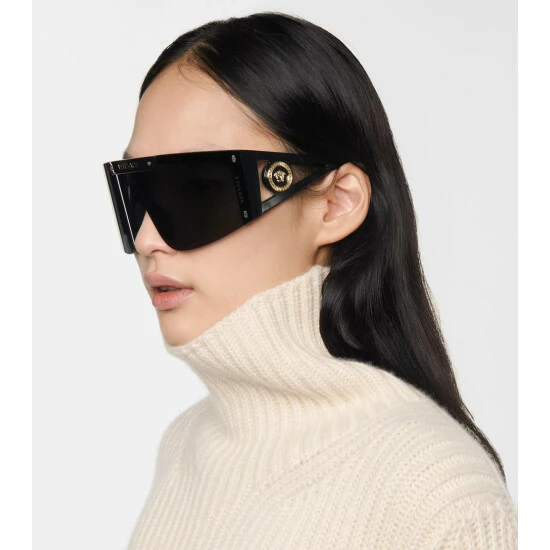 The Versace brand is synonymous with statement style, which can be easily achieved with these oversized sunglasses. Made in Italy from acetate, the design will shade the upper half of your face. Gleaming Medusa heads glisten on the arms, providing an opulent finishing touch.