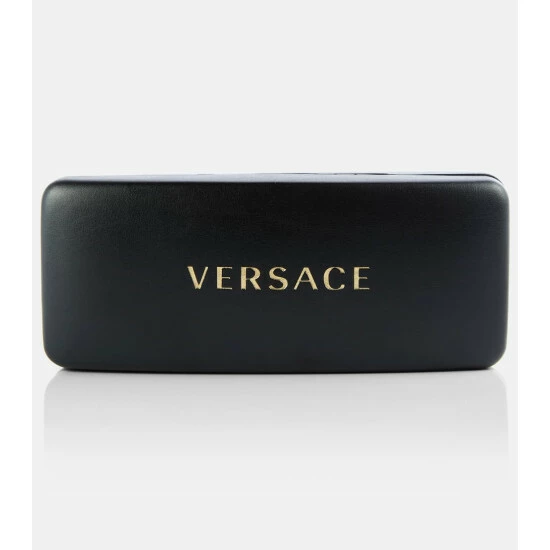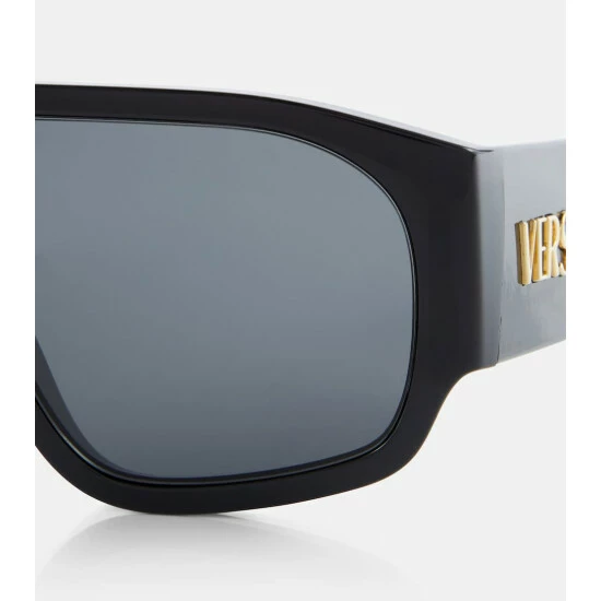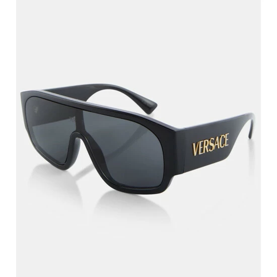These Versace sunglasses are defined by their sporty, shield-like appearance. The oversized and flat frames are accented by thick temples with golden logo lettering.