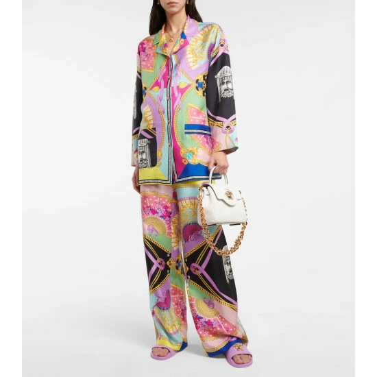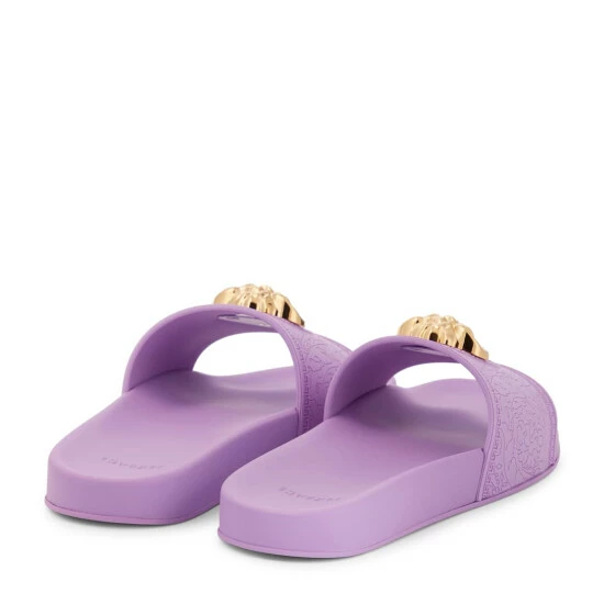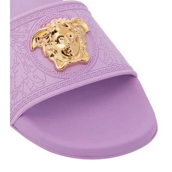 The Palazzo Pool slides from Versace are adorned with gleaming Medusa logo plaques. Made from rubber, they have carved uppers featuring the brand’s recurring Greca motif.