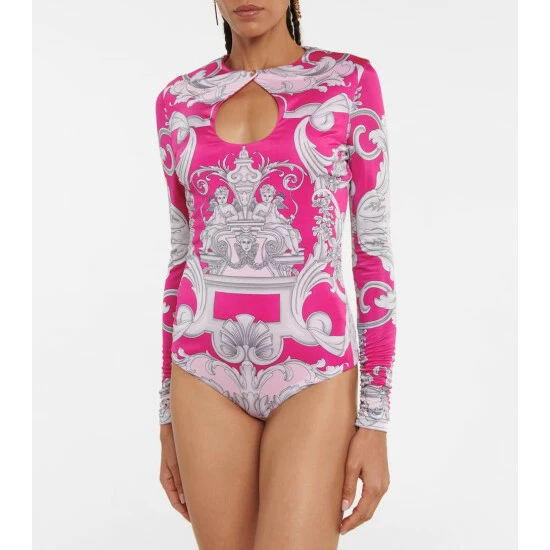 A Versace bodysuit makes a sleek base layer to any look. Showcasing one of the brand’s iconic prints, this long-sleeved bodysuit has a keyhole detailing at the front.