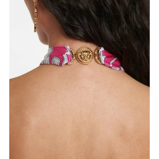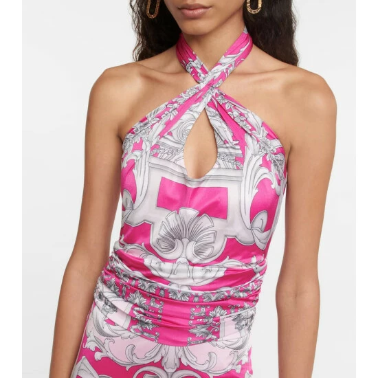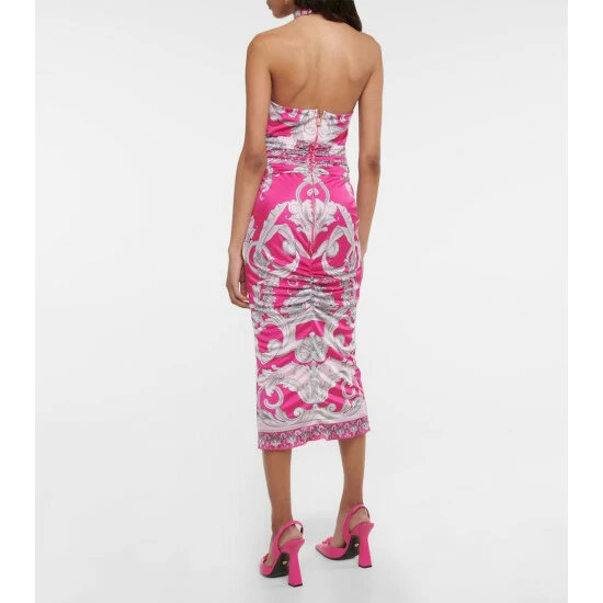 Featuing a signature Baroque print, this midi dress from Versace has a halterneck and a streamlined silhouette.
