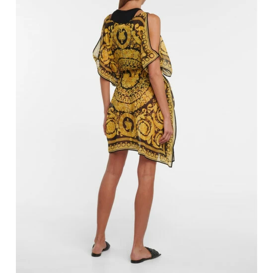 This gold and black kaftan from Versace is printed with the label’s iconic Barocco print. Made from silk, it has a boatneck and a self-tie waist.