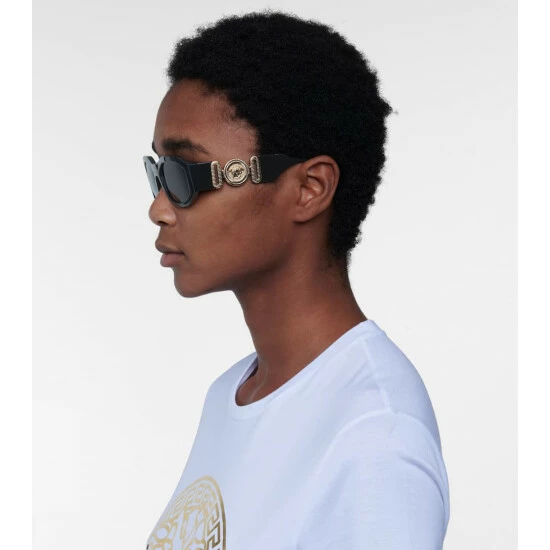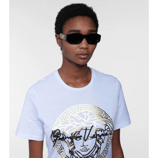 Bring a dose of opulence to your look with this pair of black sunglasses from Versace. This rectangular shaped design has been crafted in Italy and is adorned with golden detailing of the brand’s iconic medusa emblem for instant recognition. Wear yours to complement gold jewelry.