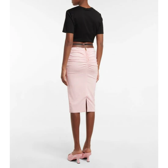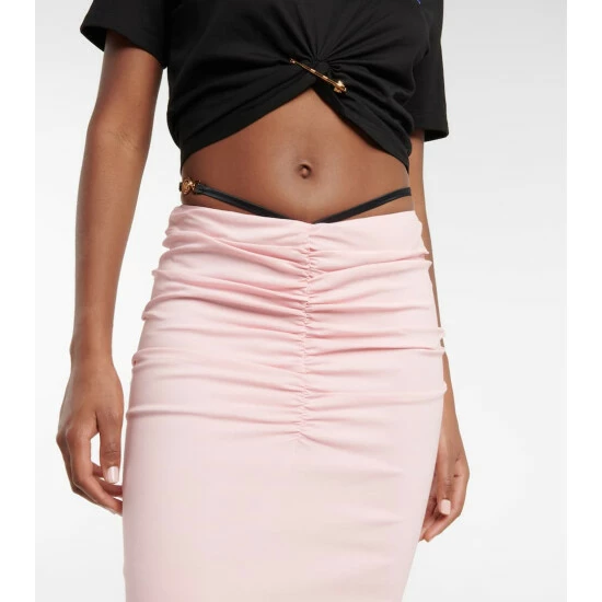 Made of lightweight stretchy jersey, this Versace midi skirt features flattering ruching and thin straps that frame the skin in slim triangles. Gold-toned Medusa hardware glints subtly on the right hip.