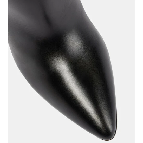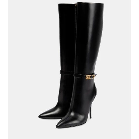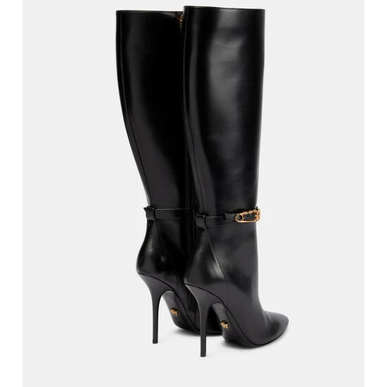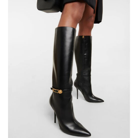 These Versace boots are cut from smooth leather to a streamlined silhouette with tall shafts, towering stiletto heels, and razor-sharp profiles. Note the brand’s iconic Medusa-embellished Safety Pin motif at the buckles.