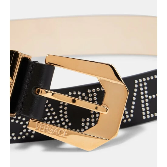 Versace showcases its empowered vision with this embellished calfskin belt. Detailed with studs lettering, the adjustable length of this style secures with a gold-tone Medusa Heritage buckle.