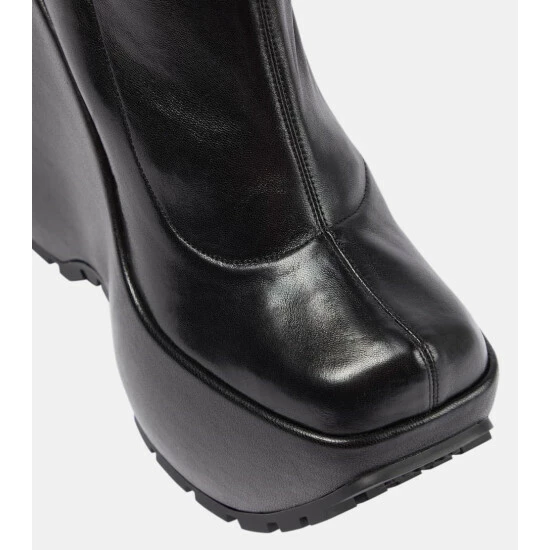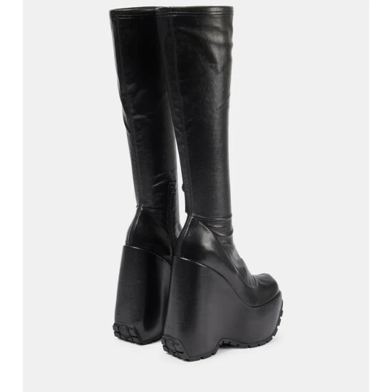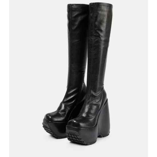Take your footwear edit to new heights with the Triplatform boots from Versace. Made with a triple platform wedge heel, these knee-high leather boots have fitted construction with a lugged sole.