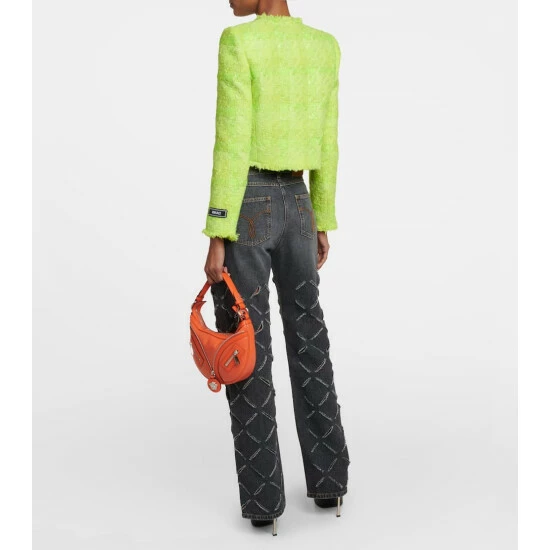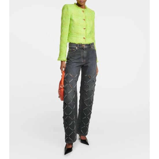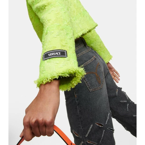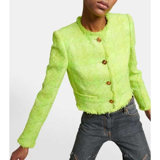 Versace experiments with the classics for this amped-up tweed jacked. Defined by traditional styling, this collarless style appears in a zesty lime shade with frayed trims and engraved Medusa buttons.