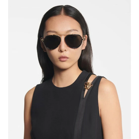 Versace sunglasses, like this Vintage Icon aviator pair, are designed to add glamour to your wardrobe. Slim golden frames hold gray tinted lenses, which, at category 3, are more than suitable for shielding you from harmful UVA and UVB rays. Please note the color of the protective case may vary.